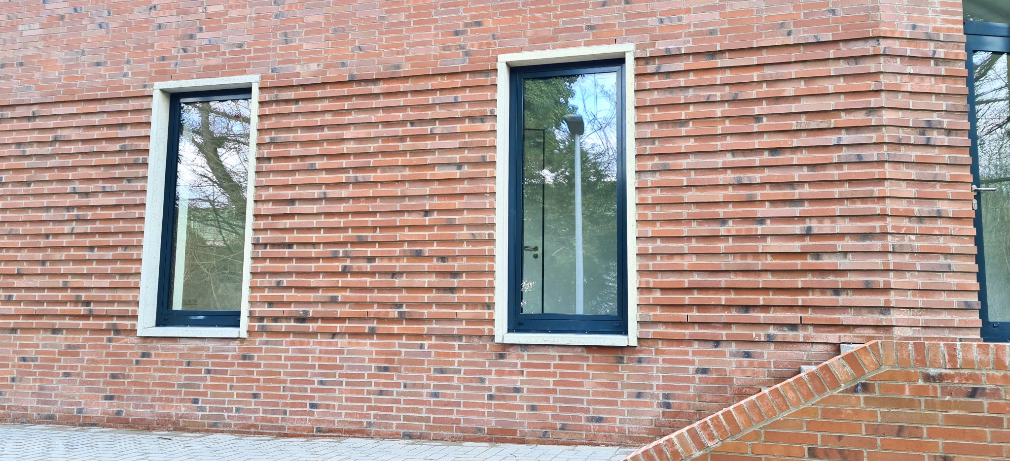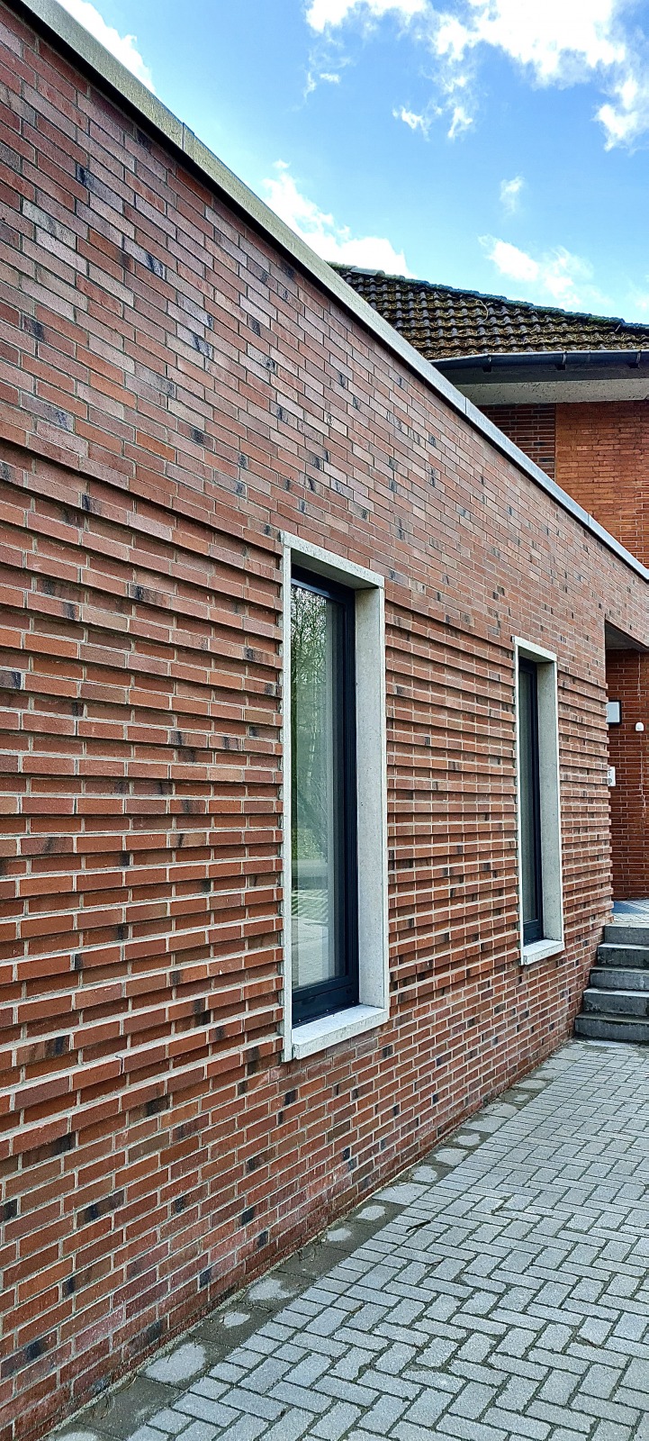 Die Fenster des Anbaus sind vertikal betont und werden durch Betonstein eingerahmt. Hierdurch entstehen Lichtschlitze in der Fassade, die die besondere Struktur des Verblendsteinmauerwerks nochmals hervorheben. Die eigentlich massive Verblendsteinfassade wirkt dadurch offen und transparent. Die gesamte Fassade konzentriert sich auf wenige Materialien und erzeugt so eine zeitlose Optik.