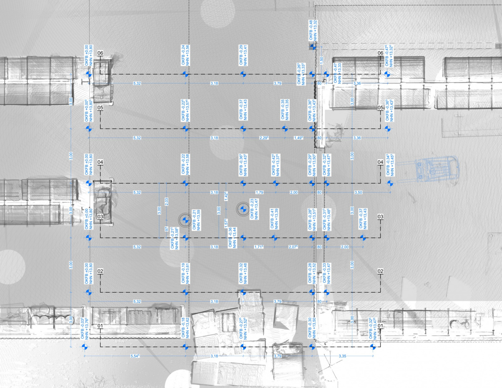 Weiterhin können in diesem Verfahren auch Schachtdeckelhöhen, Durchfahrtshöhen und bestehende Regalanlagen aufgemessen und überprüft werden. Sämtliche Bauteile werden daraufhin mit vorhandenen und neu zu ergänzenden CAD-Zeichnungen verschiedener Hersteller und Lieferanten abgeglichen und aufeinander abgestimmt. Logistikflächen im Bestand werden insofern optimiert und zukunftsfähig.