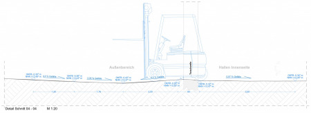 Problematisch für den Staplerverkehr kann insbesondere eine zu geringe Bodenfreiheit im Bereich vorhandener Torschwellen werden. Die genauen Höhen lassen sich im Bestand mit herkömmlichen Aufmaß-Verfahren nur schwer messen. Mithilfe des dreidimensionalen Laserscans können sämtliche Fahrbereiche der Gabelstapler vor Ort in kurzer Zeit erfasst werden.