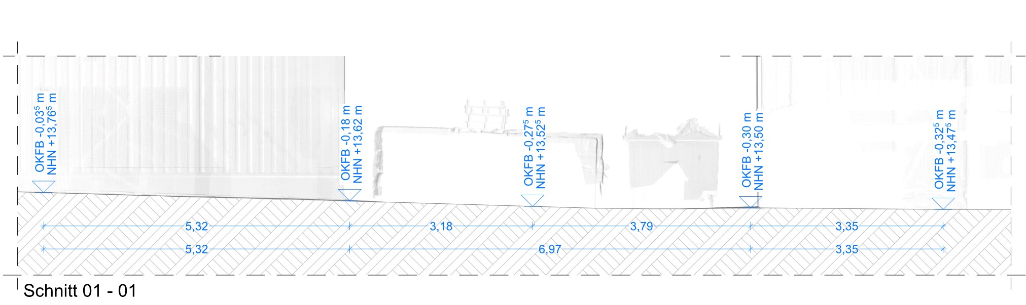 Durch Einlesen der Punktwolke in ein 3D-fähiges CAD-Programm werden anschließend aus dem 3D-Laseraufmaß beliebig viele zweidimensionale Schnitte generiert. Die Bodenfreiheit des Gabelstaplers wird nun anhand importierter Zeichnungen digital überprüft. Kollisionspunkte werden dabei sofort erkannt. Das Aufmaß wird exakt dokumentiert und in einem Deckenhöhenplan ausgegeben.