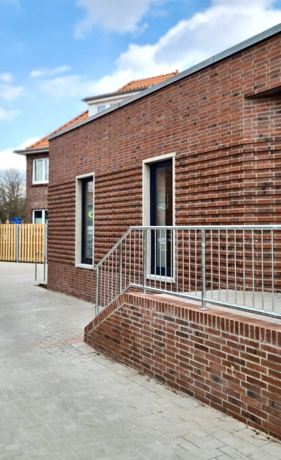 Für die neue Einrichtung wurde ein ehemaliges Wohngebäude umgebaut und durch einen eingeschossigen Anbau mit moderner Verblendsteinfassade erweitert. Architektonisch sollte sich der neue Verblendstein dem bestehenden Gebäude anpassen, gleichzeitig aber ein Neubau mit eigenständigem Charakter entstehen. Dies wurde insbesondere durch im Wechsel vorspringende Verblendsteinschichten erreicht, die ein umlaufend horizontales Band zwischen den Fenstern bilden.