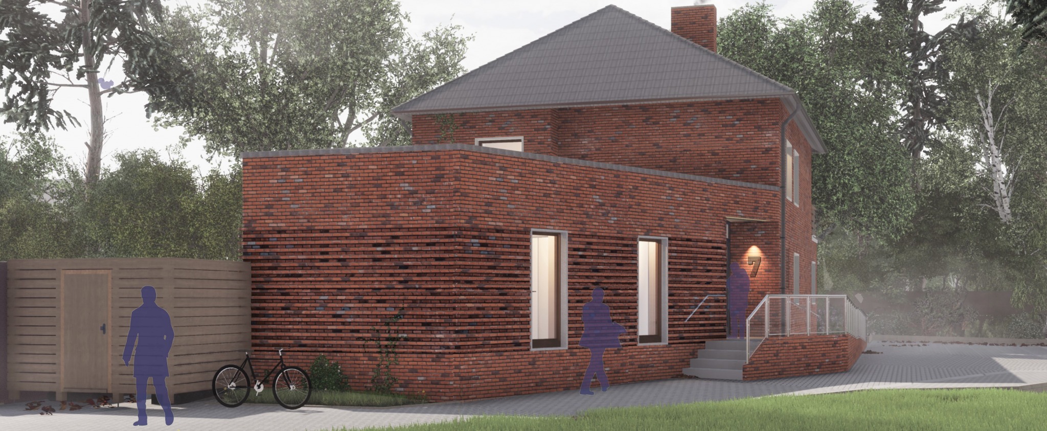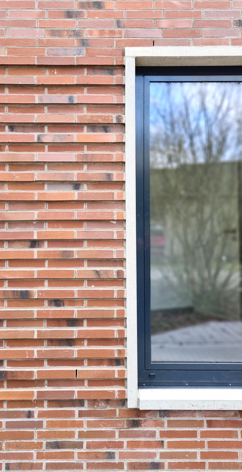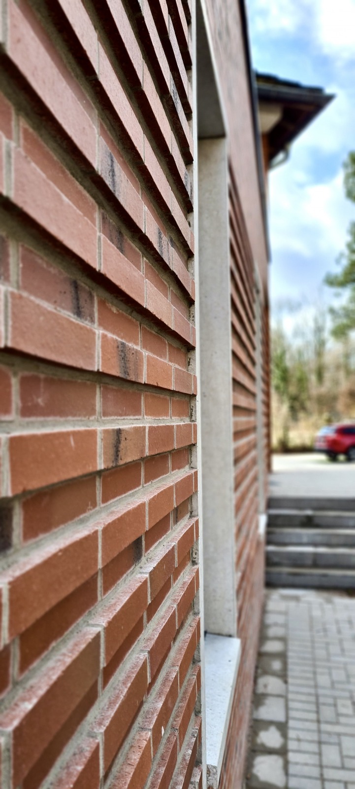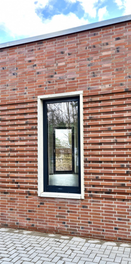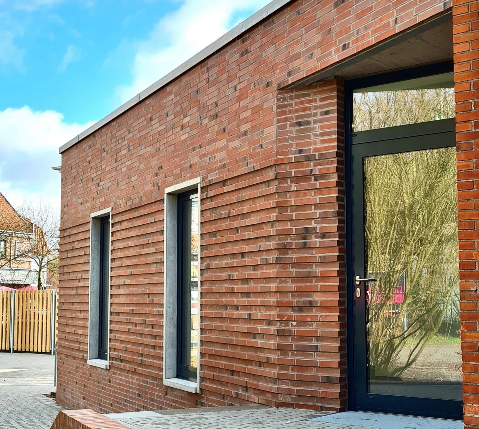Die Fenster des Anbaus sind vertikal betont und werden durch Betonstein eingerahmt. Hierdurch entstehen Lichtschlitze in der Fassade, die die besondere Struktur des Verblendsteinmauerwerks nochmals hervorheben. Die eigentlich massive Verblendsteinfassade wirkt dadurch offen und transparent. Die gesamte Fassade konzentriert sich auf wenige Materialien und erzeugt so eine zeitlose Optik.